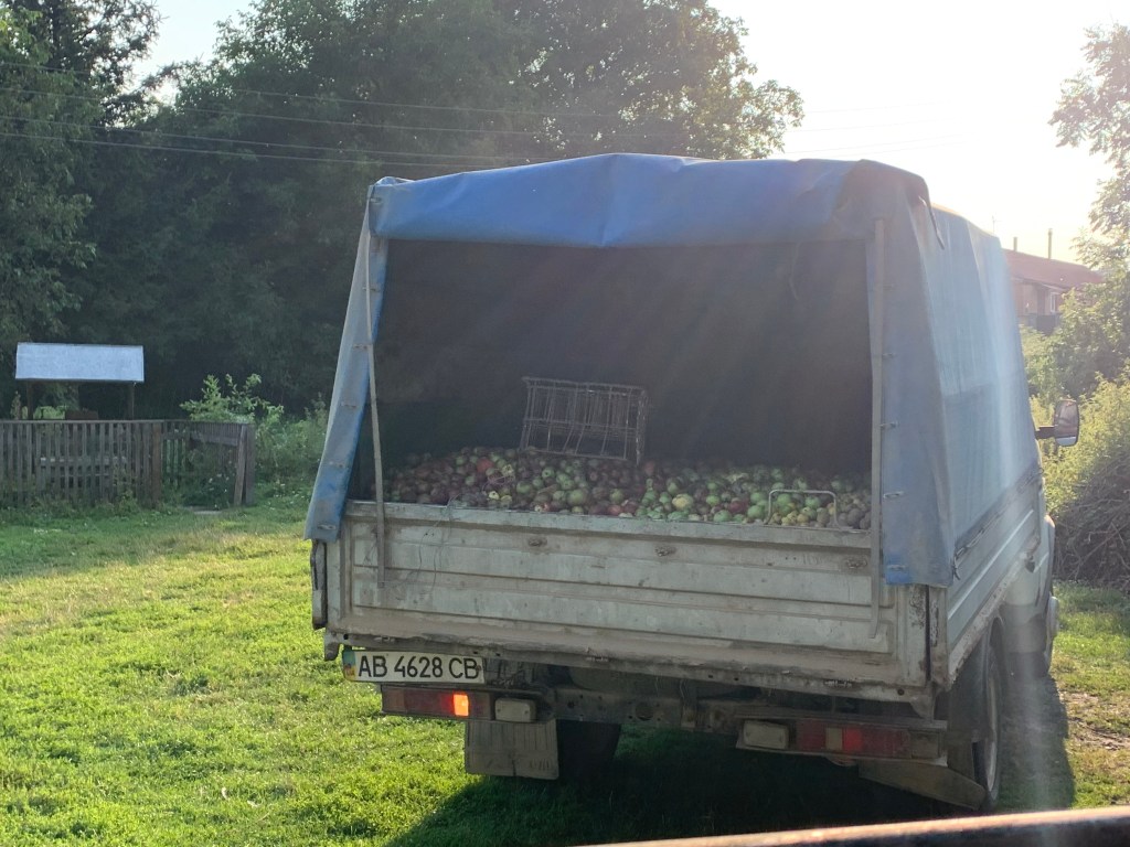 Maybe I should get a job. Selling bread-flavoured sodapop (kvas), selling honey, bike courier, taxi driver, bus driver, teaching english. My anti-capitalist brain tells me that my desire to get a job is just me being insecure about my worth in a society that values you solely based on your salary. My bank account tells me otherwise. And seeing old people sit on the concrete selling wilted plums makes me feel guilty for being previously paid an hourly wage equal to their monthly pension, as though I had something to do with global wealth inequality and amassing of colonial wealth. So I find solace in incorrectly sewing and then seam-ripping adaptive underwear for veterans with prosthetics. Or carrying a long stick with a hook at the end of it, letting gravity pummel me with apples as I shake branches of 100-year-old trees to collect fruit to sell to the juice man for 10₴/kg (25¢/kg). Each metric tonne we collect eases my insecurities, each apple welt brings me closer to the village god of labour — the permanently bent-over бабуся (babusia).