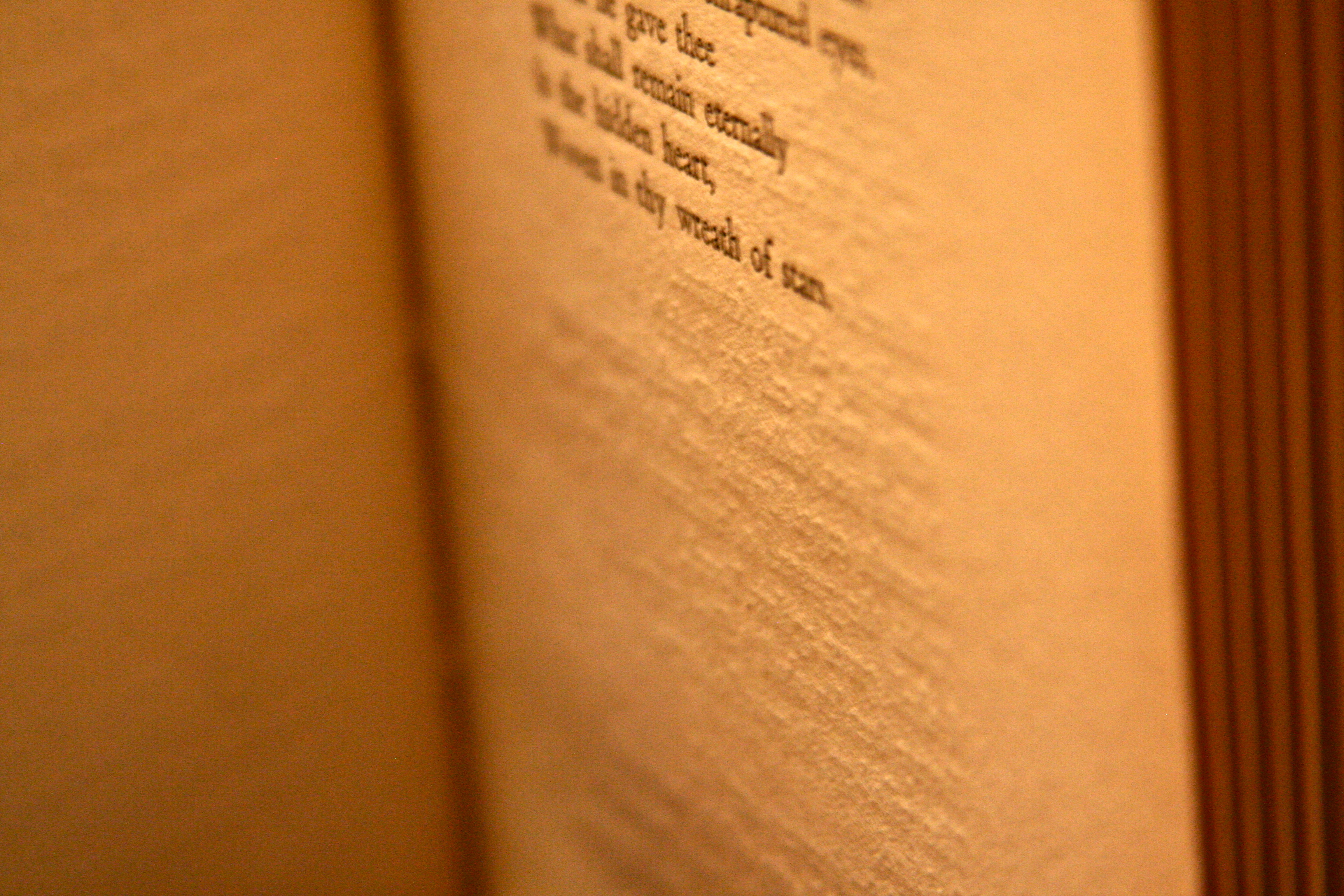 This book was printed when typewriters were the technology that reflected speed and efficiency. The words are embossed into the paper like braille. The words are three dimensional.